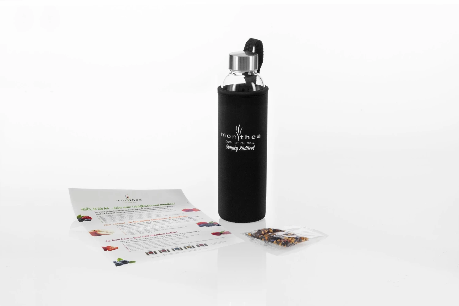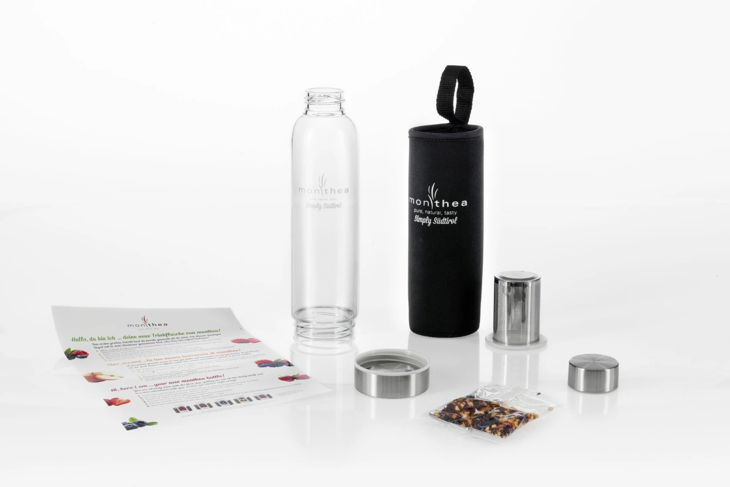 | Material | Glasflasche mit komplett herausnehmbaren Filter aus Edelstahl Neopren Socke |