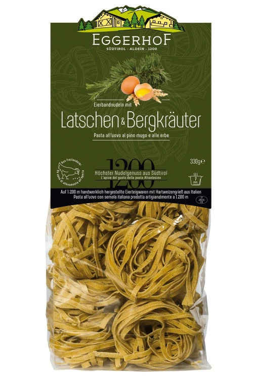 | Produkt | Nudeln aus Hartweizengrieß und frischen Freilandeiern, verfeinert mit Latschenkiefer und Bergkräutern |