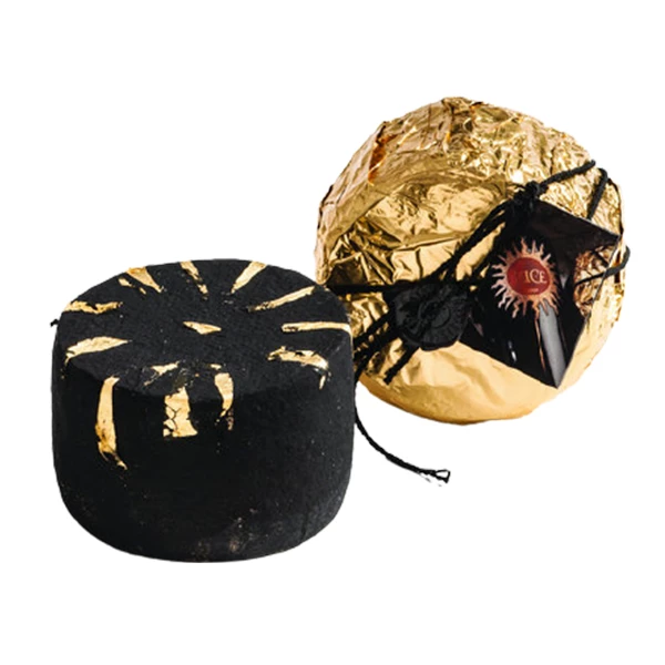 | Produkt | Luce Hartkäse aus Kuhrohmilch veredelt mit Traubenkernöl, natürliche Holzkohle, Algen, vierziert mit Blattgold |