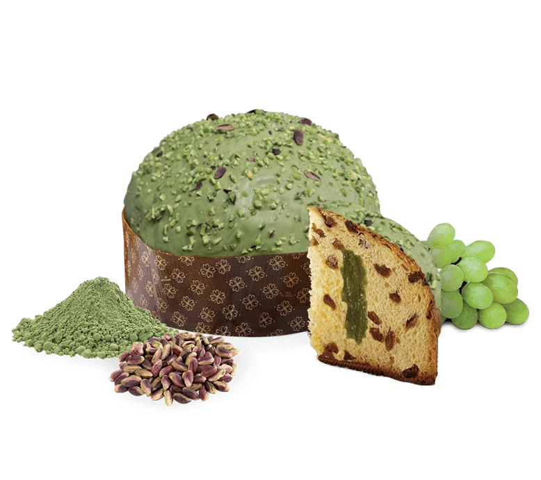 Weizenmehl Typ „0“, Rosinen (16%), Sahne mit „PISTACCHIO verde di Bronte* DOP“ (15%) [Zucker, Paste „PISTACCHIO verde di Bronte* DOP“ (21%), Glukosesirup, Wasser, frische Butter (MILCH), natürliche Aromen. (MILCH), natürliche Aromen, Salz], frische Eier aus Freilandhaltung in Italien, weiße Schokolade (10%) (Zucker, Kakaobutter, Milchpulver, Emulgator: Sonnenblumenlecithin, natürliches Vanillearoma) Zucker, natürliche Sauerteighefe (WEIZEN), frische Butter (MILCH) (6%), frisches Eigelb aus Freilandhaltung in Italien Emulgator: Mono- und Diglyceride von Fettsäuren pflanzlichen Ursprungs, Wildblütenhonig aus Sizilien, „PISTACCHIO verde di Bronte* g.U.“ ganz und in Körnern in unterschiedlichen Anteilen (2%), Frischmilch (1%), Frischrahm (1%). (1%), Matcha Grüner Tee (1%), Cervia Vollmeersalz, Kakaobutter, natürliche Vanille Mananara aus Madagaskar* (0,2%), natürliche Aromen. *SLOW FOOD PRÄSIDIUM