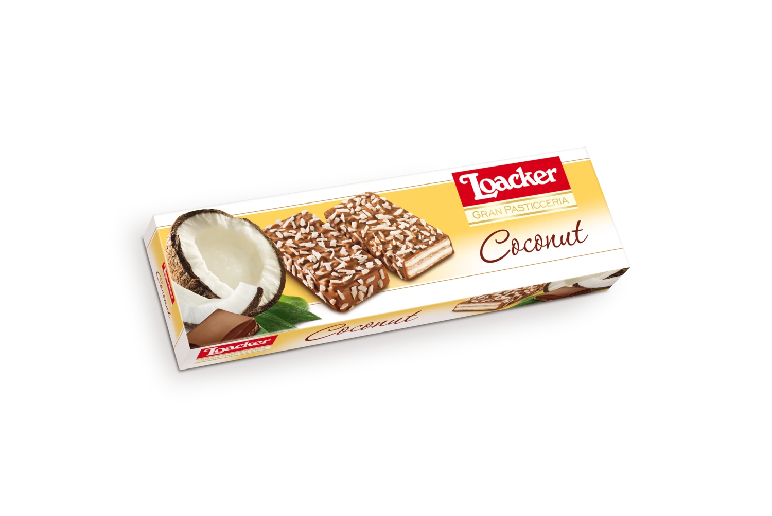 Mit echten Kokosflocken in der Creme. Loacker Gran Pasticceria – Edle Patisserie, geschaffen für höchsten Genuss: feinste Schokolade, knusprig-leichte Waffelblättchen und ein Herz aus zart schmelzender Creme. Coconut: Ein exotischer Genuss – einfach himmlisch! Schicht auf Schicht harmonieren knusprige Waffelscheiben mit feiner Kokoscreme, einer Glasur aus köstlicher Milchschokolade und der Kaskade aus frischen Kokosflocken. Willkommen im Paradies.