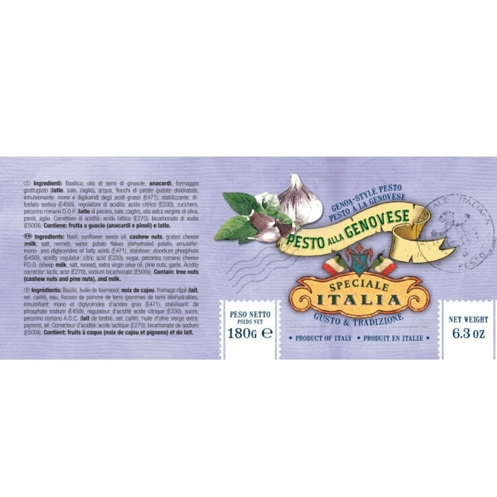 | Zutaten | Basilikum Sonnenblumenkernöl Cashews Geriebener Käse Wasser Kartoffelflocken Säureregulator: Zitronensäure Zucker Pecorino Romano D.O.P. Natives Olivenöl extra Pinienkerne Knoblauch Säurekorrektor: Milchsäure, Natriumbikarbonat |