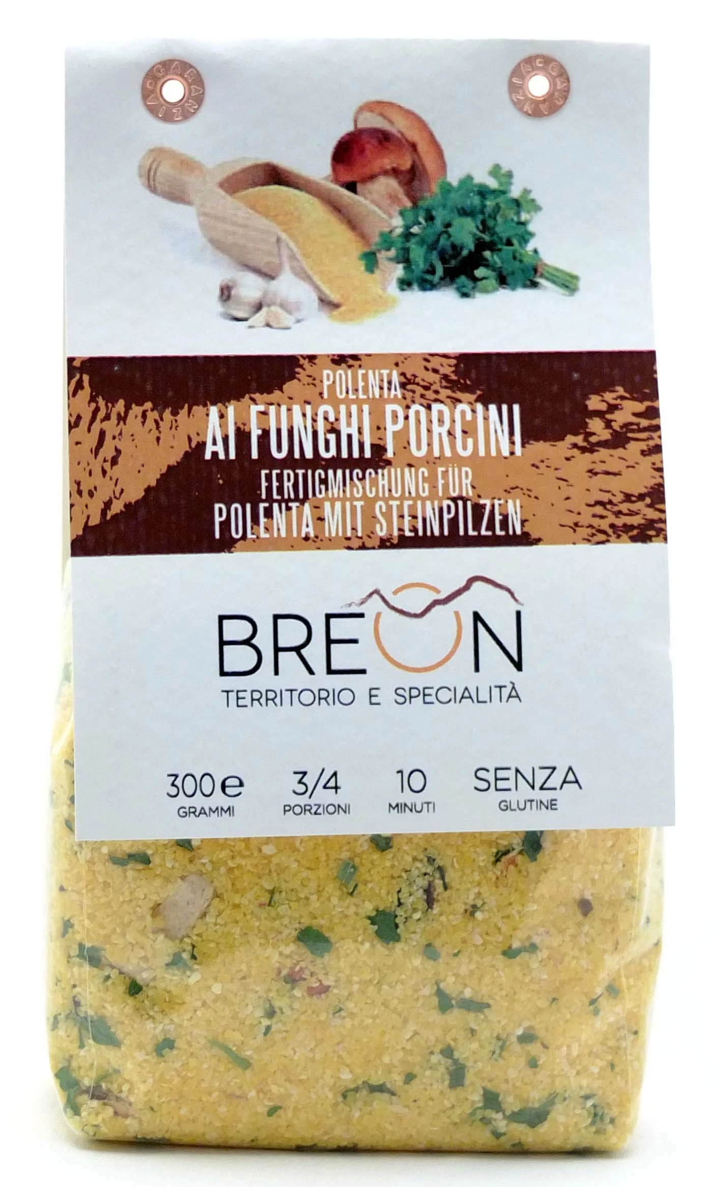 | Zutaten | 91% Polenta – Maismehl 5% Steinpilze – Boletus Edulis Karotten Schnittlauch Knoblauch Petersilie |