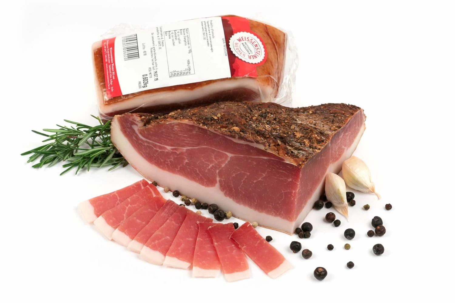 Zutaten: Schweinefleisch, Salz, Pfeffer, Knoblauch, Saccharose, Pigment, Wacholder, Lorbeerblatt, Koriander, Konservierungsmittel: E250 E252